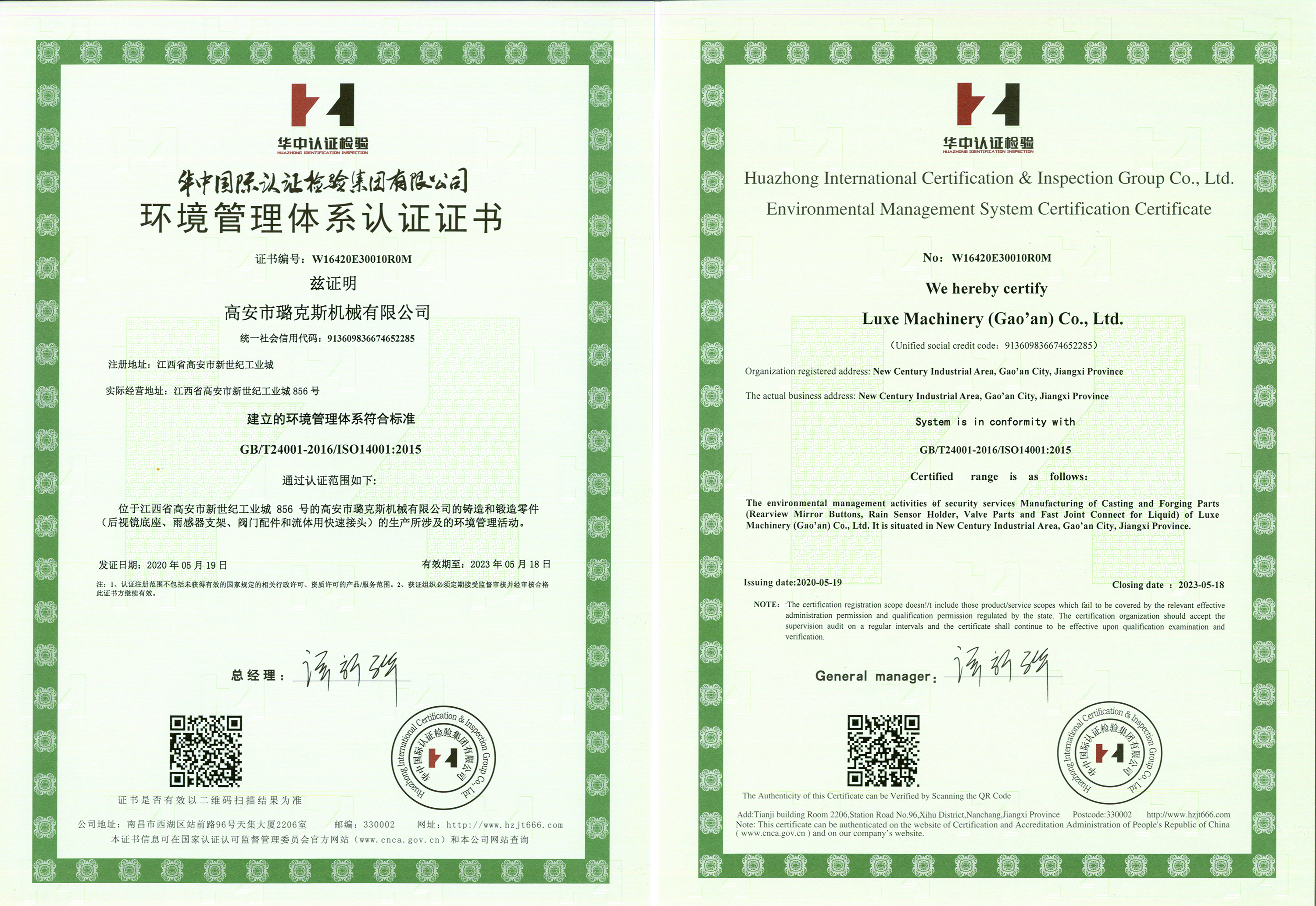 環(huán)境管理體系認(rèn)證證書